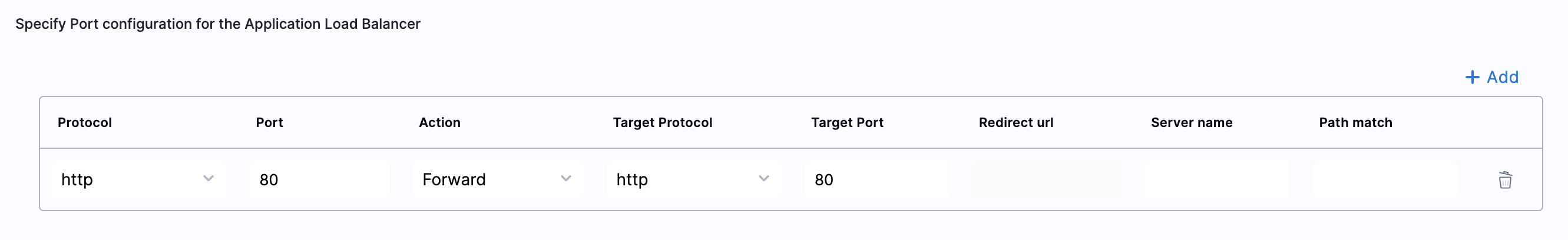 Each row in the Port config table represents an ALB rule in Harness. The information provided in the row is translated into an ALB rule by the Harness backend. Therefore, the Server name field has a limit of five domains.