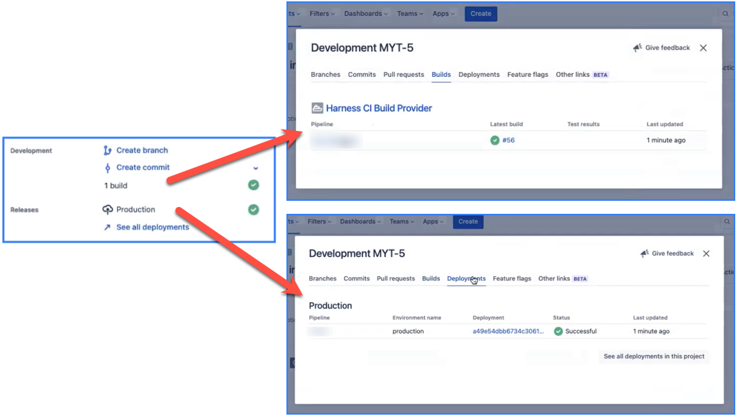 After the build runs, you can see updates to Build and Deployment fields on the Jira issue associated with the build. If you drill down into these fields, you can find links to the build in Harness.