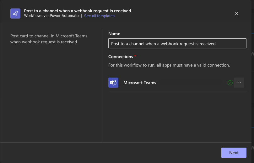 - In the Workflows section, select the workflow Post to a channel when webhook request is received.