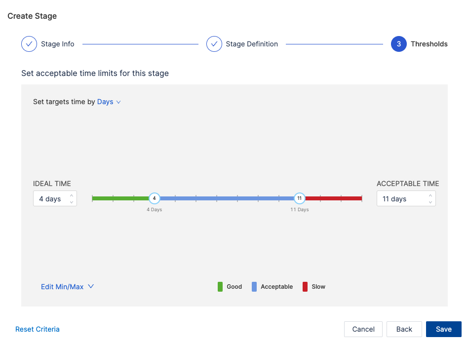 - Set acceptable time ranges for the stage, such as Ideal Time and Acceptable Time.